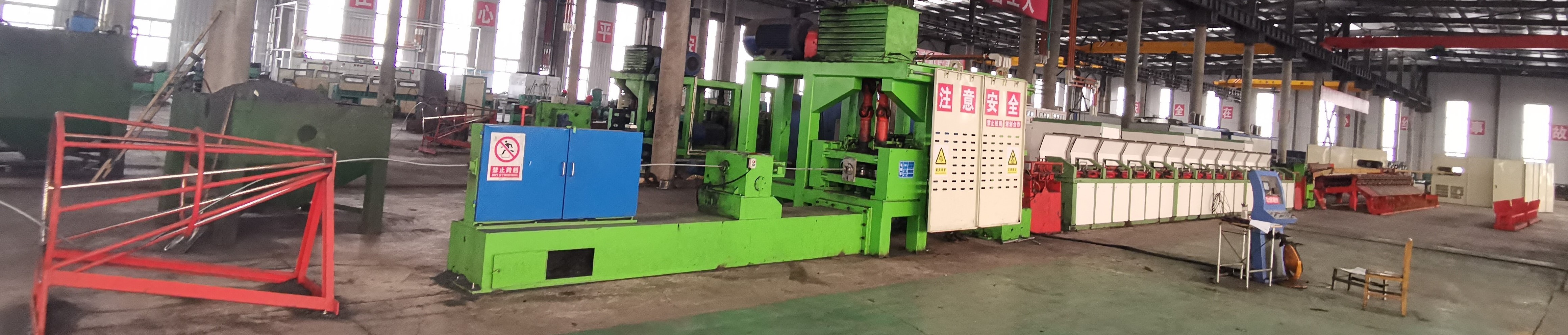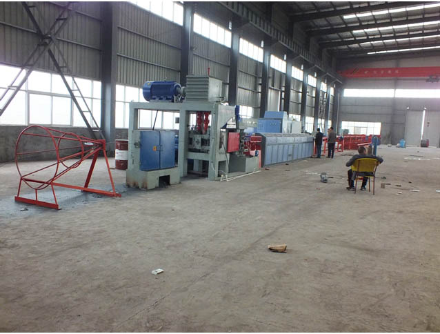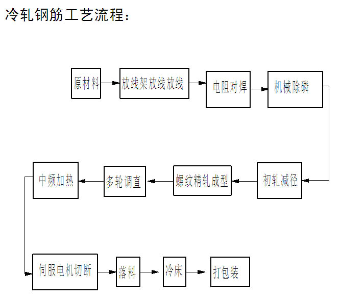 1、工藝簡介 本機組是用于生產冷軋二面帶肋鋼筋的專用設備,該套生產線可將Φ12-Φ14mm的Q235、300熱軋盤圓鋼筋(圖1),冷軋制成兩面有月牙的帶肋鋼筋(圖2) 圖1盤圓 圖2二面帶肋鋼筋 全套設備由放線架、整線籠、除鱗機、付軋機、主軋機、矯直、加熱、測溫、剪切、滑道、兩面接料、氣動自動推平、收線機等組成。機組按連續工作制設計,整套設備由PLC+觸摸屏系統控制。 下面是各組成部分結構及性能的簡單描述: (1)放線架 放線架的作用是保證該機組的高速運行,立式放線架(缺點是放線灰塵比炮筒式要大),一個是工作架,另一個是備儲架,當一個在放線時可對另外一個料架進行預裝料。當工作架上的盤圓放完時,將該卷盤圓的尾端與另備儲架上盤圓的頭端對焊打磨后,可繼續開機,可提高因停機后裝料而降低工作效率。