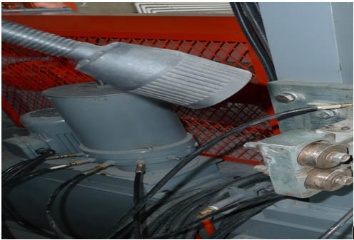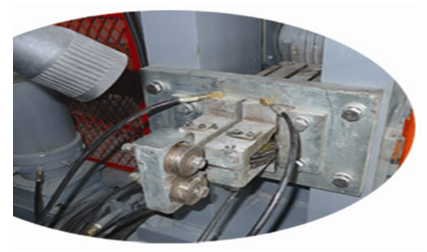 注:本設備采用用紅外線非接觸式測溫方式,光纖傳導,抗干擾能力強,數字顯示溫度。 (6)加熱柜(見上總圖) 此套設備運行的成本是電費,鋼筋加熱設備好壞直接體現在耗電指數上,采用高性能中頻加熱設備,可節約20—50度/噸電費,要求采用高性能RGBT模塊,電轉換效率高,加熱設備運行安全、可靠,綠色、環保。 (7)剪斷 剪斷采用我廠自主開發的飛剪,經過十多年的優化、技術非常成熟,具有行業領跑水平,剪切動力小、反應快,故障率低,免維護,進口伺服電機,穩定可靠。操作控制采用液晶觸摸屏顯示控制+PLC,長度便于修改,具有行業領先水平,見圖片: (8)冷床: 冷床是保證鋼筋質量的的重要設備之一,特別是生產10毫米以上的鋼筋,鋼筋直徑粗、散熱比較慢、傳統做法是鋼筋加熱切斷后落到料槽內打捆放在一邊冷卻,外面的鋼筋下面的鋼筋先冷卻,捆中心鋼筋冷卻速度非常緩慢,捆心部鋼筋過度回火,導致一捆鋼筋內外質量不一致,會有少量鋼筋不合格。 我公司建議:生產10毫米以上的鋼筋最好配冷床,確保鋼筋質量。